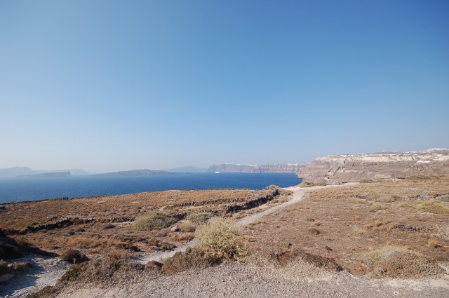 Santorini is home to a small but flourishing wine industry, based on the indigenous grape variety, Assyrtiko. Assyrtiko vines are extremely old and are resistant to phylloxera. Consequently they did not need to be replaced during the great phylloxera epidemic of the early 20th century. Assyrtiko Vines are well adapted to the Santorini habitat and are planted far apart as their principal source of moisture is dew. They are trained in the shape of baskets, with the grapes hanging inside to protect them from the winds. Also unique is the red, sweet and extremely strong Vinsanto. White wines from the island are extremely dry with a strong, citrus scent; the ash resulting from volcanoes, gives the white wines a bit of a mineral/smoke flavor much like the Visanto. It is not easy to be a wine grower in Santorini, the hot and dry climate gives the soil a low productivity. The yield per acre is only 10 to 20% of the yields that are common in France and California. That said, the wine can be delicious. It has a hint of a smokey flavor, the latter undoubtedly from the still active volcano.
