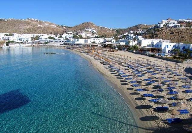 PLATYS GIALOS or PLATIS YIALOS used to be a swamp but has now been monopolised by back-to-back hotels lining the long sandy beach. The biggest and longest established resort on the island this is no place to look for a Greek holiday - there is not a trace of Greece to be seen here any more. A long crescent of sand is backed by low hills. Terraced tavernas line the sands which heave with bodies in the high season. The frequent bus services from Mykonos make this the main target of day visitors, swelling the high numbers already staying here. Watersports abound as do the howling jet skis, so pack some earplugs with the sun cream. This is also the main calling point for small boats taking visitors to the other south coast beaches and to the surrounding islands, Delos in particular.
