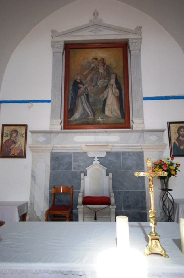 The Church has lost all this property and the courtyard of the church, which is located in frond of the central entrance. The icon of the Virgin of Rosary suffered great damage during the fire of May Day 1991. After restoration which it underwent in Tinos by the icon restored Anna Prelorentzou from Komi , Tinos , the icon was transported with pomp and ceremony by his Reverence Fr. Nicholas Printesi , Archbishop of Naxos - Tinos - Mykonos etc. at which many worshippers, especially from Tinos, were present . On 8th October 1997 His Reverence consecrated the new marble Holy Table which came from the offerings of the faithful.