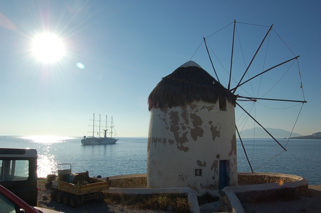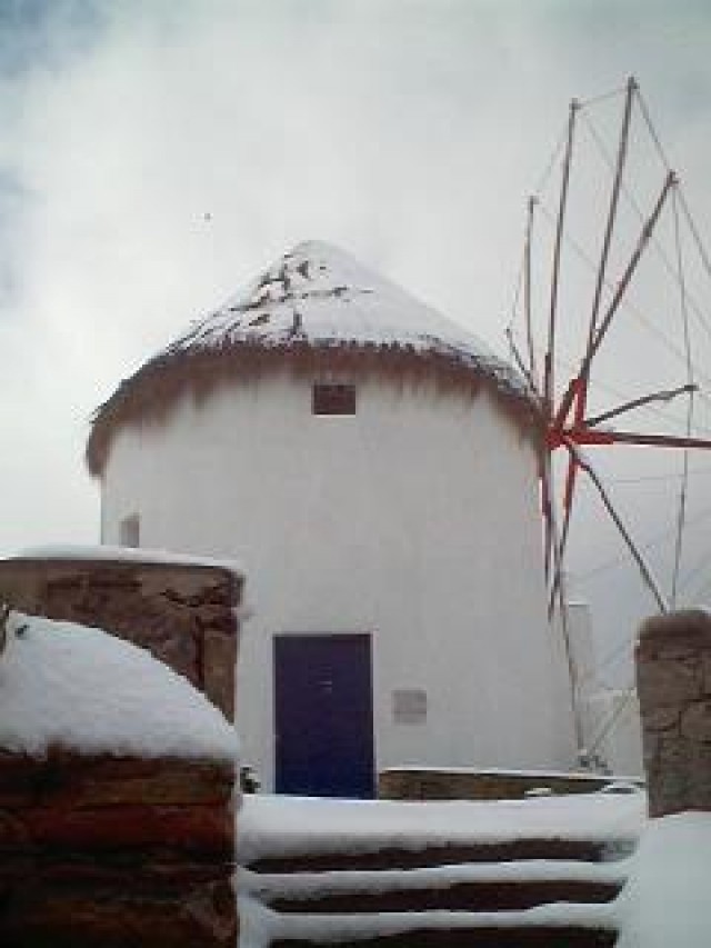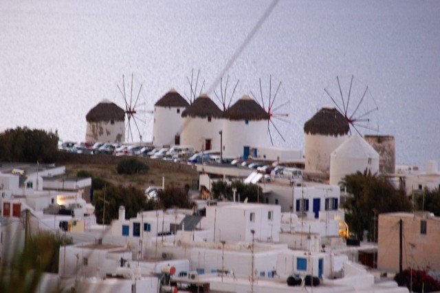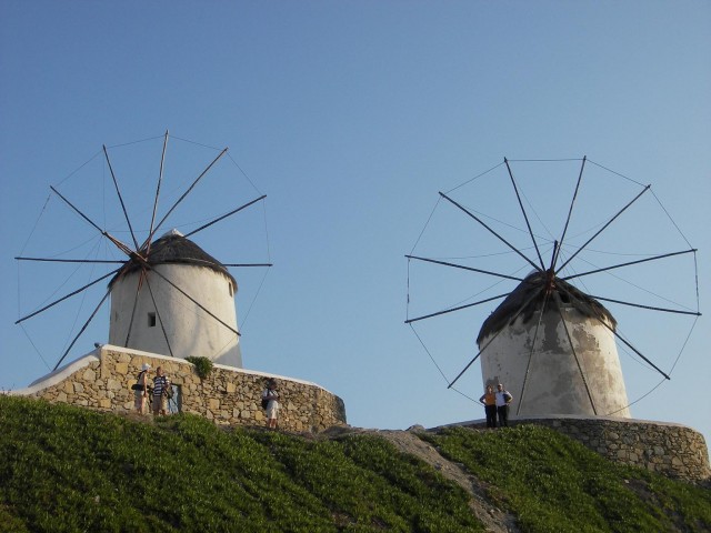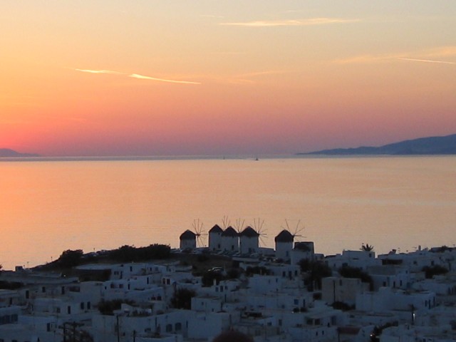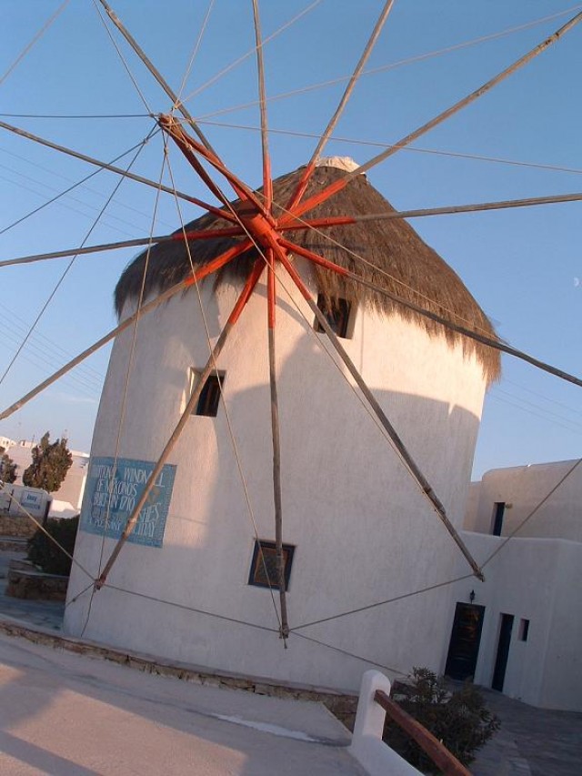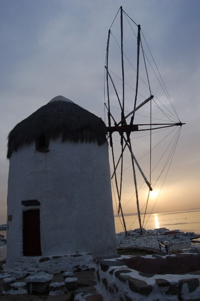 Windmills - From as early as the 16th century one of the most recognized landmarks of Mykonos have been the windmills. Due to it"s geographic position, Mykonos was situated on major sea trade-route which at one time joined Venice, the gateway of Europe, to Asia. The need to refine grain and compact it for transport combined with an ample year round supply of wind made Mykonos the perfect location. Easy access to the harbor was necessary so most of the island"s mills were positioned in or around the main port with the highest concentration covering the entire western portion of town. With the coming of industrialization the windmills importance began to decline as well as their numbers. The cluster of Kato Myloi (Lower Windmills), which rise proudly over the sea, on the small hill southwest of Hora (the city of Mykonos).